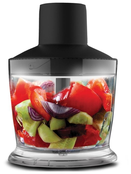 Насадка-блендер, насадка-венчик, нож измельчителя — всё из нержавеющей стали. Чаша измельчителя ёмкостью 500 мл, чаша для смешивания ёмкостью 600 мл.