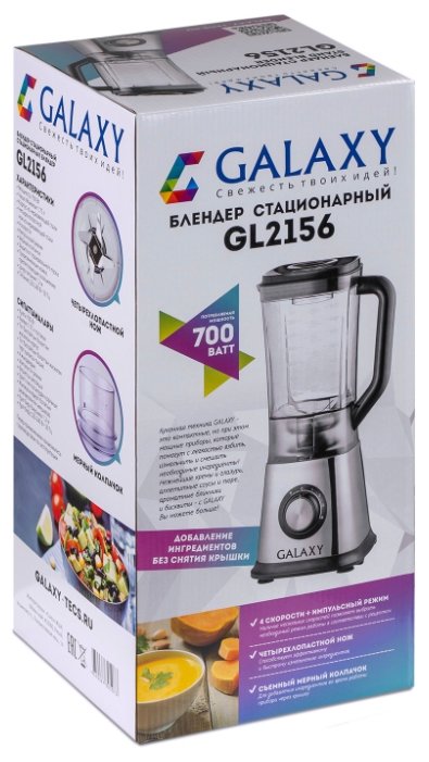 С помощью стационарного блендера GALAXY GL 2156 можно легко и быстро приготовить пюре, тесто и соусы, взбить различные коктейли и другие напитки, муссы, приготовить много других привычных и экзотических блюд. Данная модель снабжена вместительной чашей объемом 1,75 л. Сверху на чаше расположен носик, который позволяет легко разливать готовые напитки. Стильный и прочный корпус прибора выполнен из нержавеющей стали, равно как и четырехлопастной нож. Стационарный блендер GALAXY GL 2156 имеет 4 скоростных режима и импульсный режим, благодаря чему измельчение и смешивание осуществляются максимально эффективно. Прорезиненные ножки препятствуют скольжению, и надежно фиксируют прибор на рабочей поверхности.