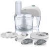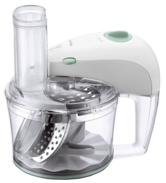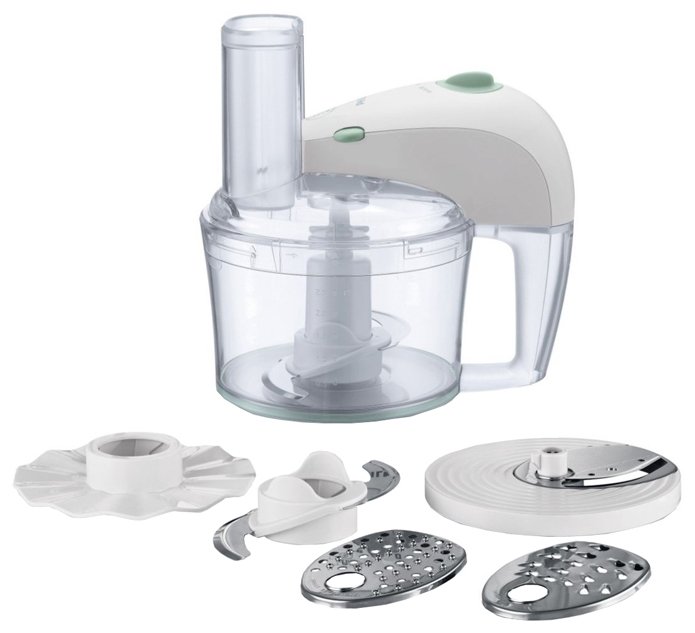 В комплект поставки кухонного комбайна входят 5 различных насадок, выполняющих 15 различных функций. Насадки для замешивания жидкого и густого теста можно мыть в посудомоечной машине. Нож из нержавеющей стали для приготовления мяса и овощей. Металлический шинковочный диск для шинковки среднего размера, нарезки средними ломтиками и измельчения. Диск для приготовления эмульсий, например взбитых сливок и майонеза.