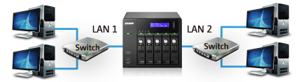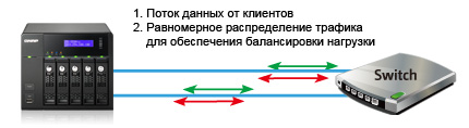 Накопитель будет распределять трафик по двум каналам в зависимости от семи возможных вариантов настройки интерфейсов. Для некоторых вариантов необходим Ethernet-коммутатор с поддержкой 802.3ad.