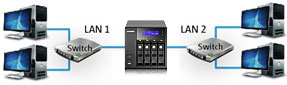 Накопитель будет распределять трафик по двум каналам в зависимости от семи возможных вариантов настройки интерфейсов. Для некоторых вариантов необходим Ethernet-коммутатор с поддержкой 802.3ad.